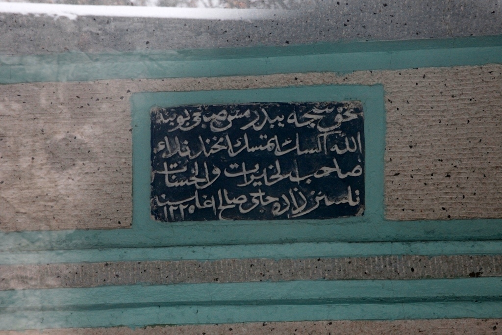 Giriş kapısı üzerindeki dört satırlık kitabeden yapının H.1225/M.1810-1811 yılında Nalsızzade Hacı Salih Ağa tarafından inşa ettirilmiş olduğu yazılıdır.