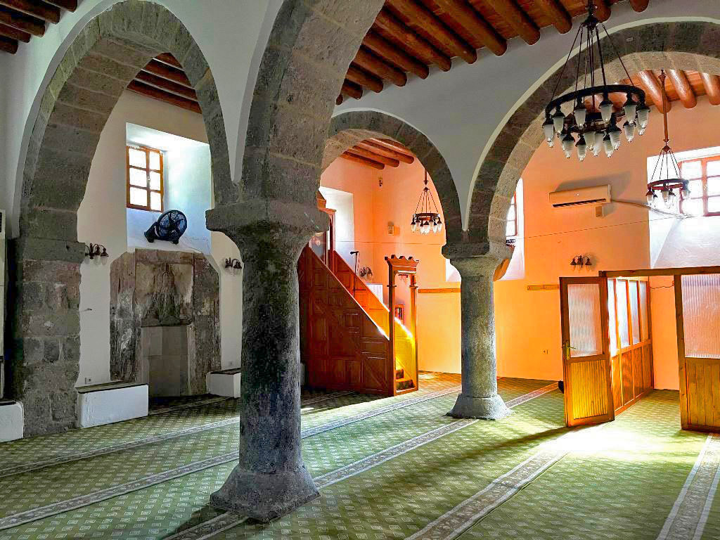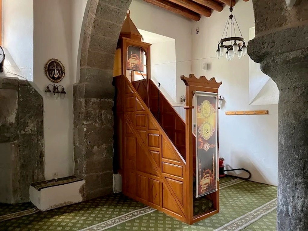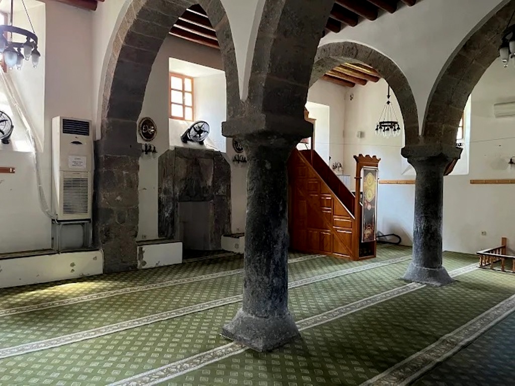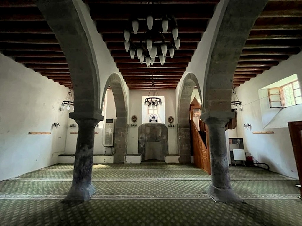 İç mekâna kuzeydeki ahşap kapıdan girilir. Harimde yer alan iki taş sütun, kesme taştan örülmüş kemerlerle birbirine ve duvarlara bağlanarak üç sahınlı bir düzen oluşturur. Mihrabı beş sıra mukarnasla süslenmiş olsa da büyük ölçüde tahrip olmuş, pervazları mermer plakalarla kaplanmıştır. Ahşap minberin sütun başlıkları sade palmet motifleriyle bezelidir. Harimi aydınlatan mazgal tipindeki pencereler farklı kotlarda yerleştirilmiştir.