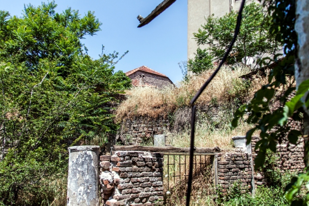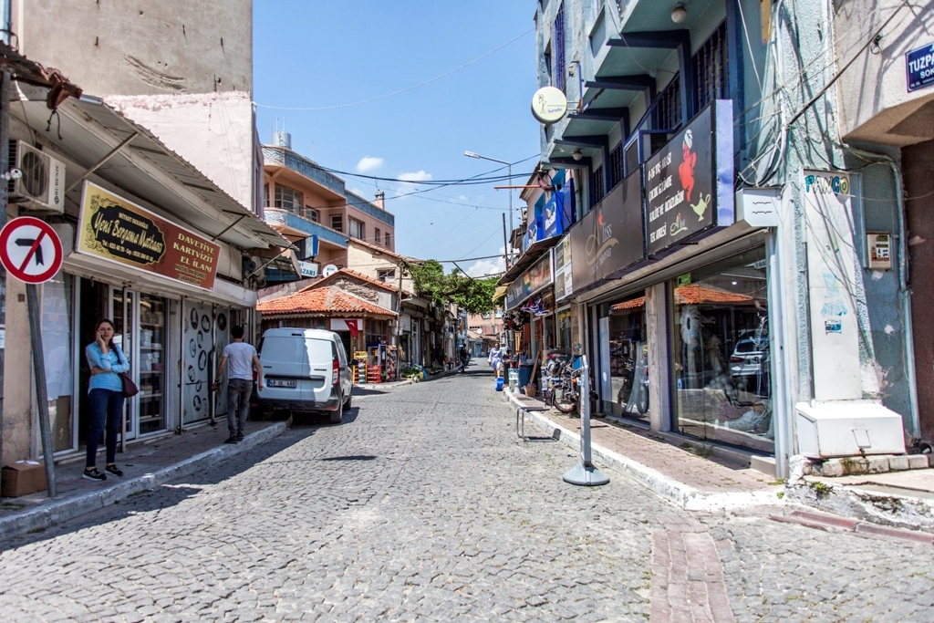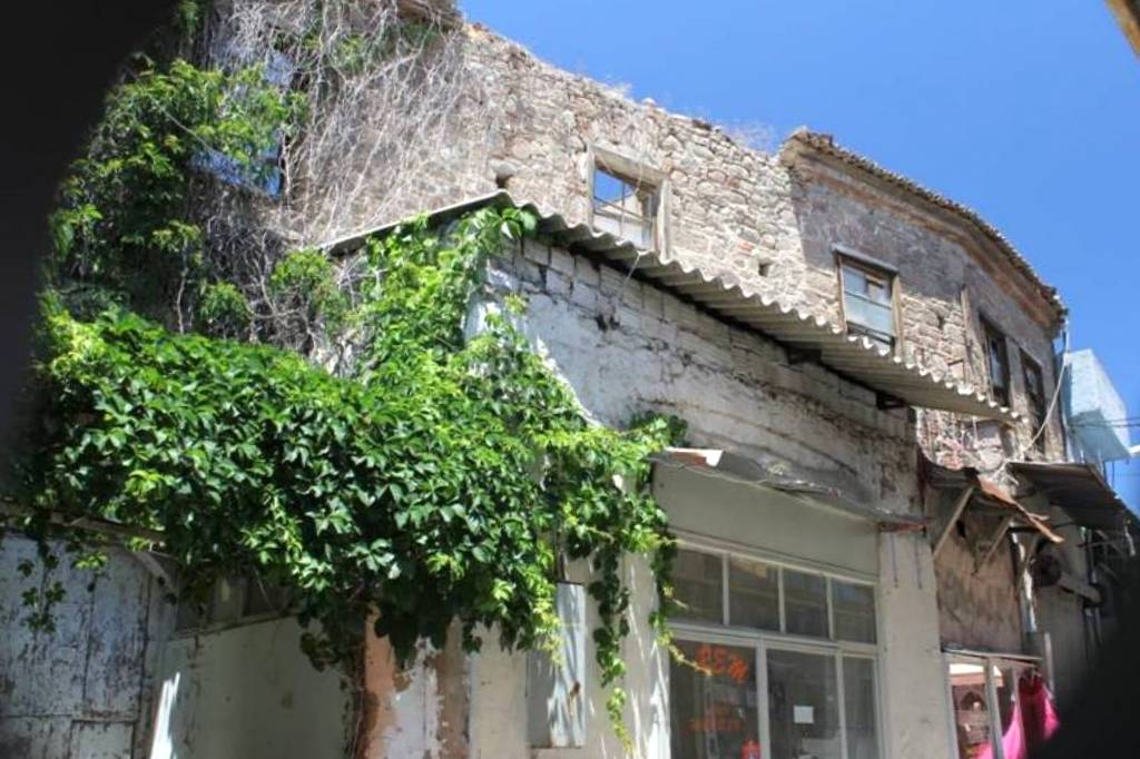 Hanın, incirli mescit tarafında bulunan duvarı, binanın yapışı hakkında iyi bir fikir vermektedir. 28.40 m. uzunluğunda olan duvar antik trahit blok taşlardan sonra, tuğlalann çerçevelediği klasik şekilde meydana getirilmiştir. Burası, iki dişli kirpi saçağı ile nihayetlenmektedir. Saçağın üstünde bulunan moloz duvar ise sonradan yapılmıştır. Bu duvarda bulunan düşey (mazgal şeklinde) dar pencereler 15×40 cm. ölçüsündedir.